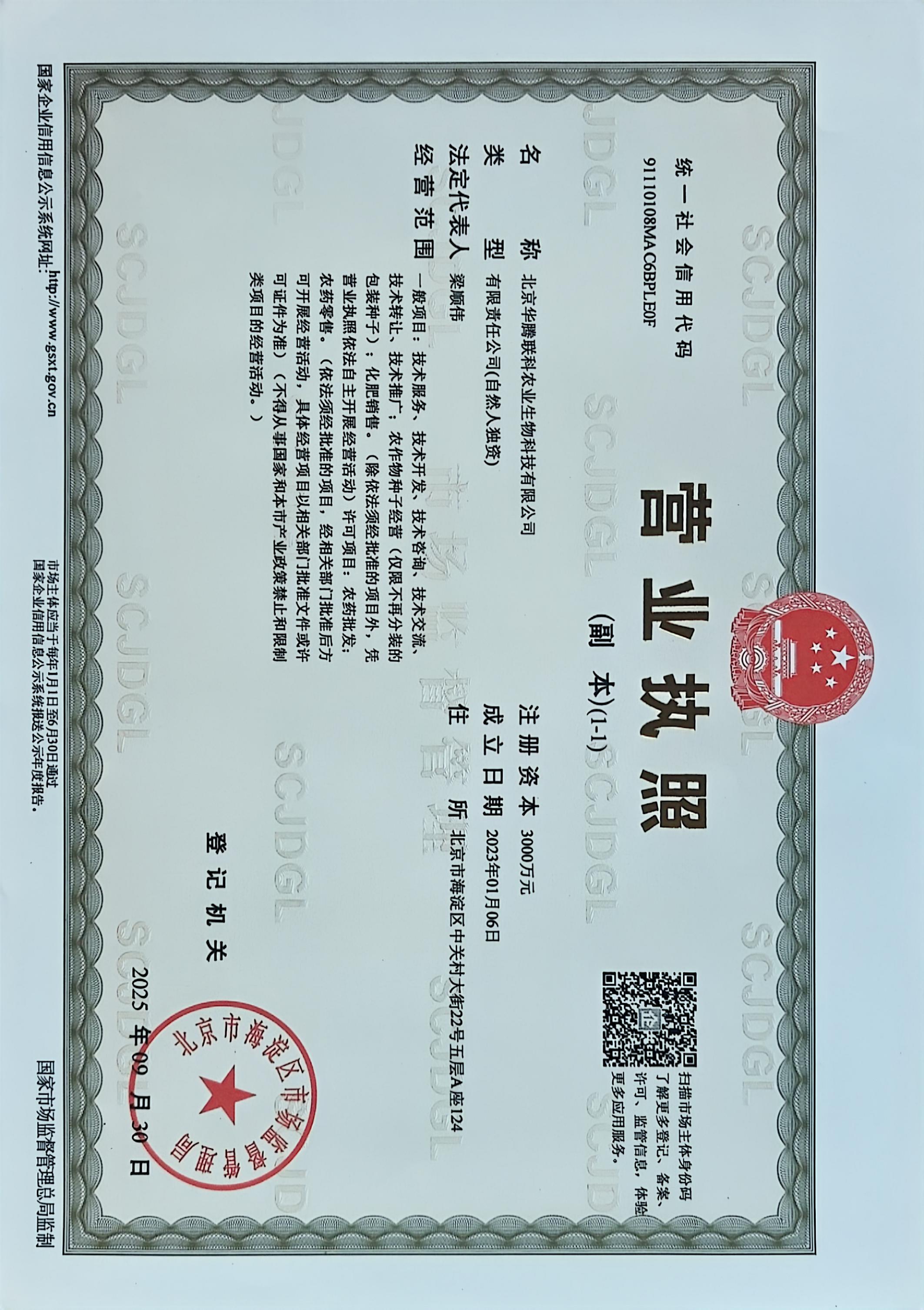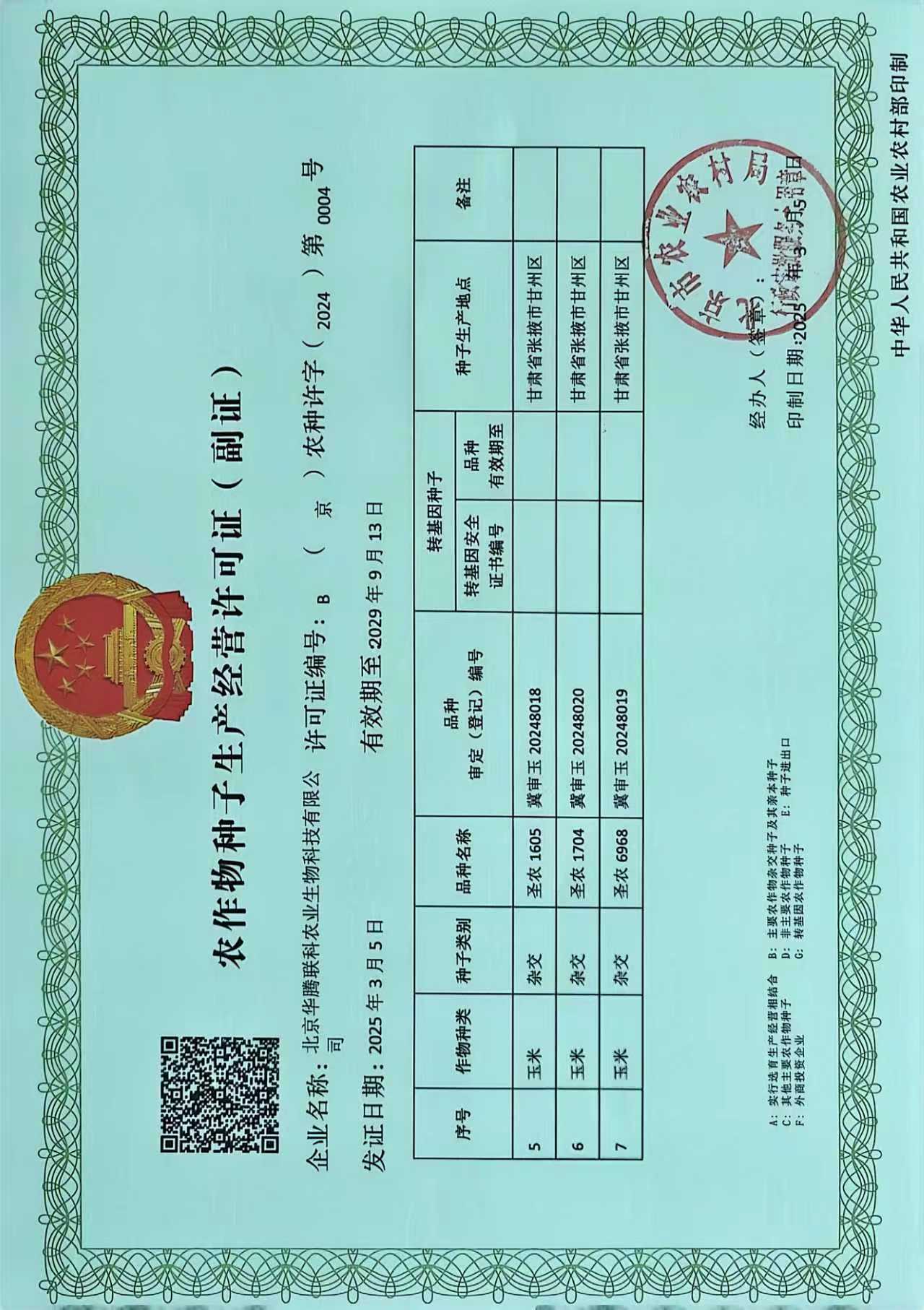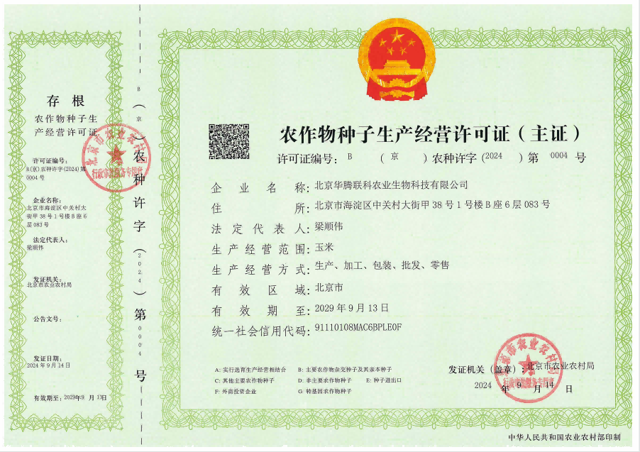 2024年9月14日,公司获得种子生产经营许可证,许可证编号为B(京)农种许字(2024)第0004号,经营范围为玉米 。